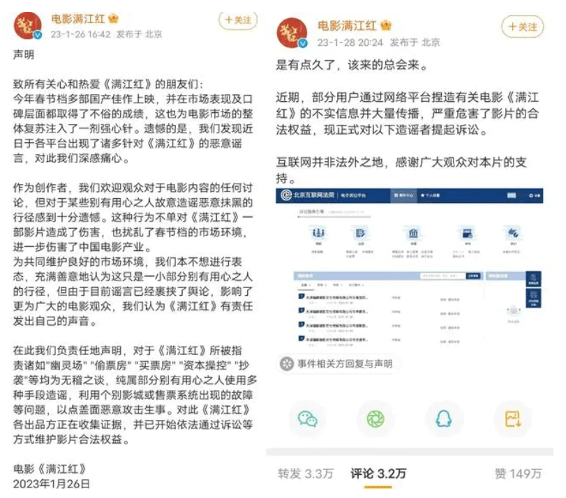还有传言说这部电影涉嫌抄袭,部分桥段与《龙门镖局》有相似之处,导致《满江红》剧组不得不出来各种澄清,还起诉了一些网友。