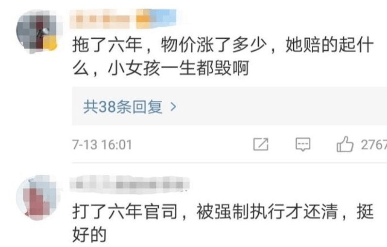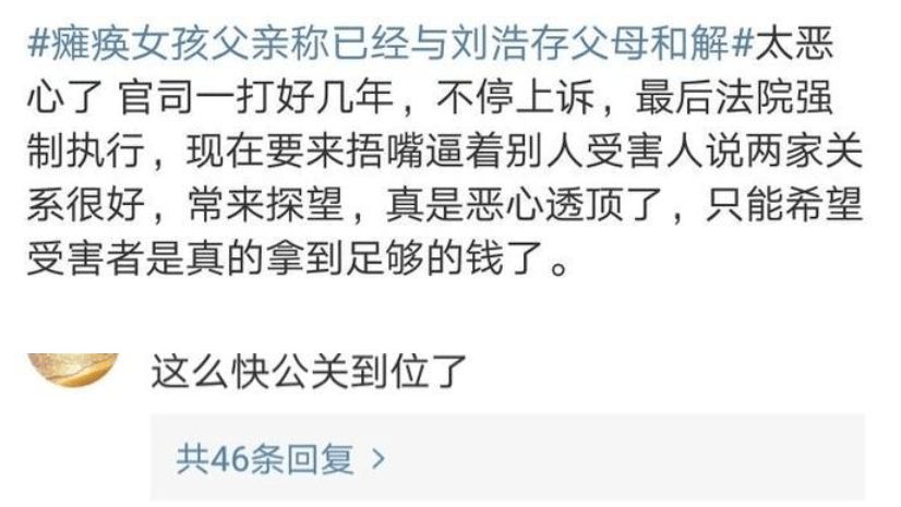 但刘浩存父母却一直拖欠这笔补偿金,直到6年后才付给对方,被网友们直批完全是“老赖”行为,说毁了别人的人生却还能安然处之。